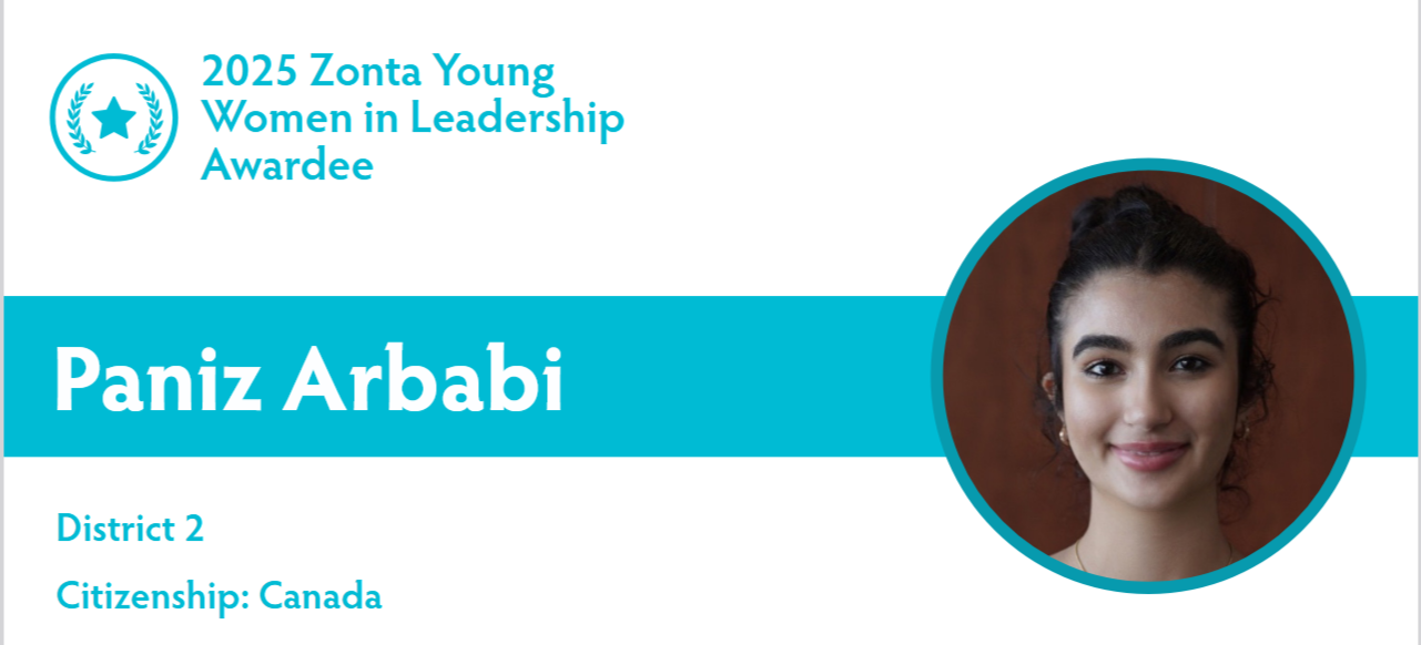 Paniz Arbabi, Zonta Club of Ottawa, Canada’s ‘2025 Zonta Young Women in Leadership Award Winner’. Paniz went on to win at Zonta District 2, and then on to win at Zonta International Level.